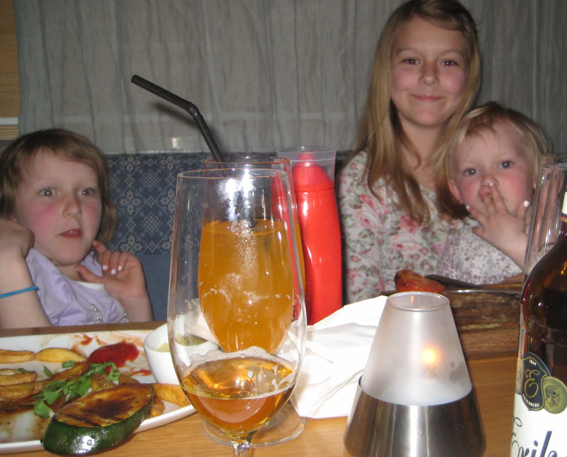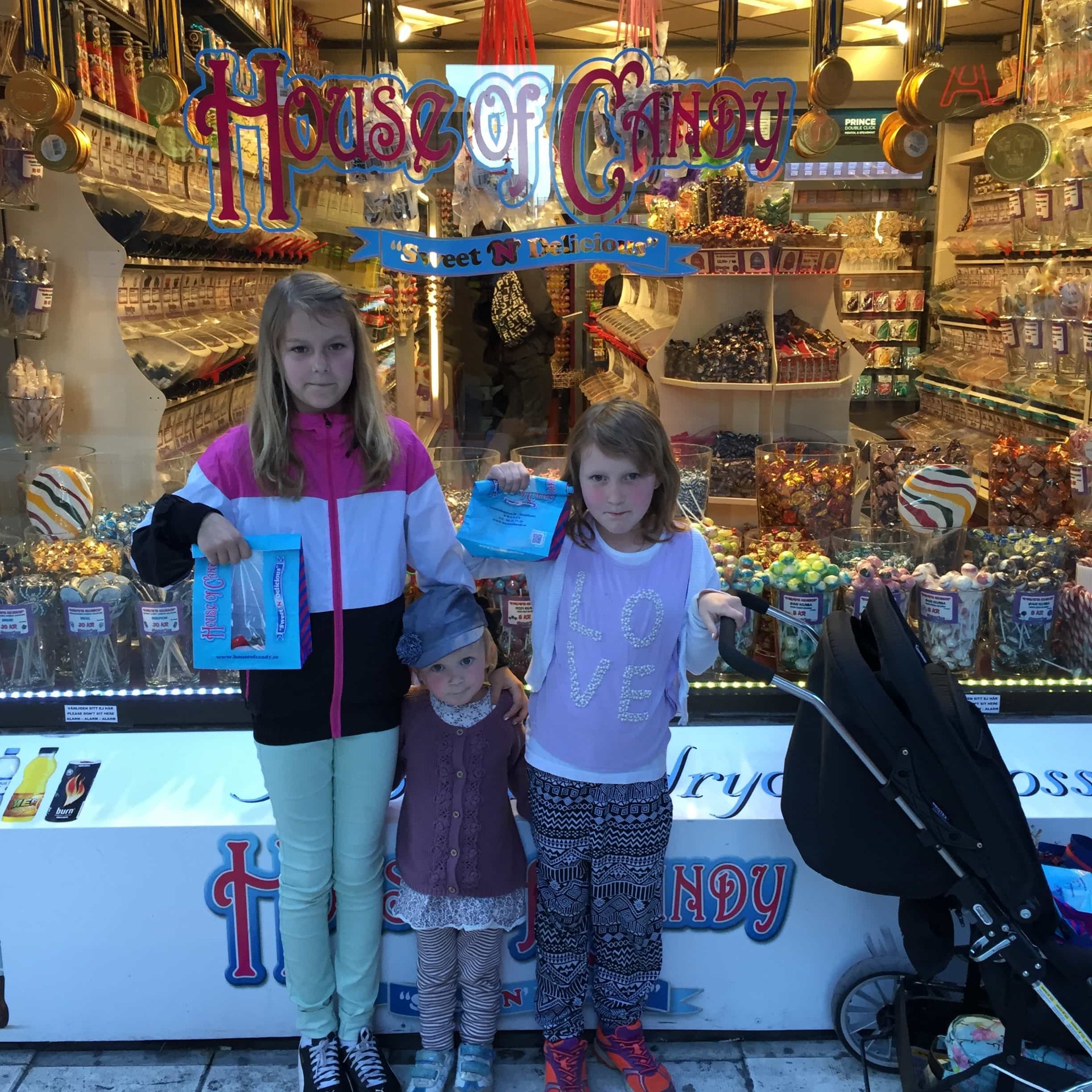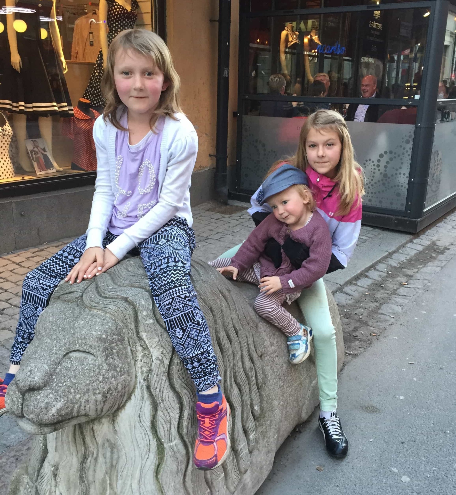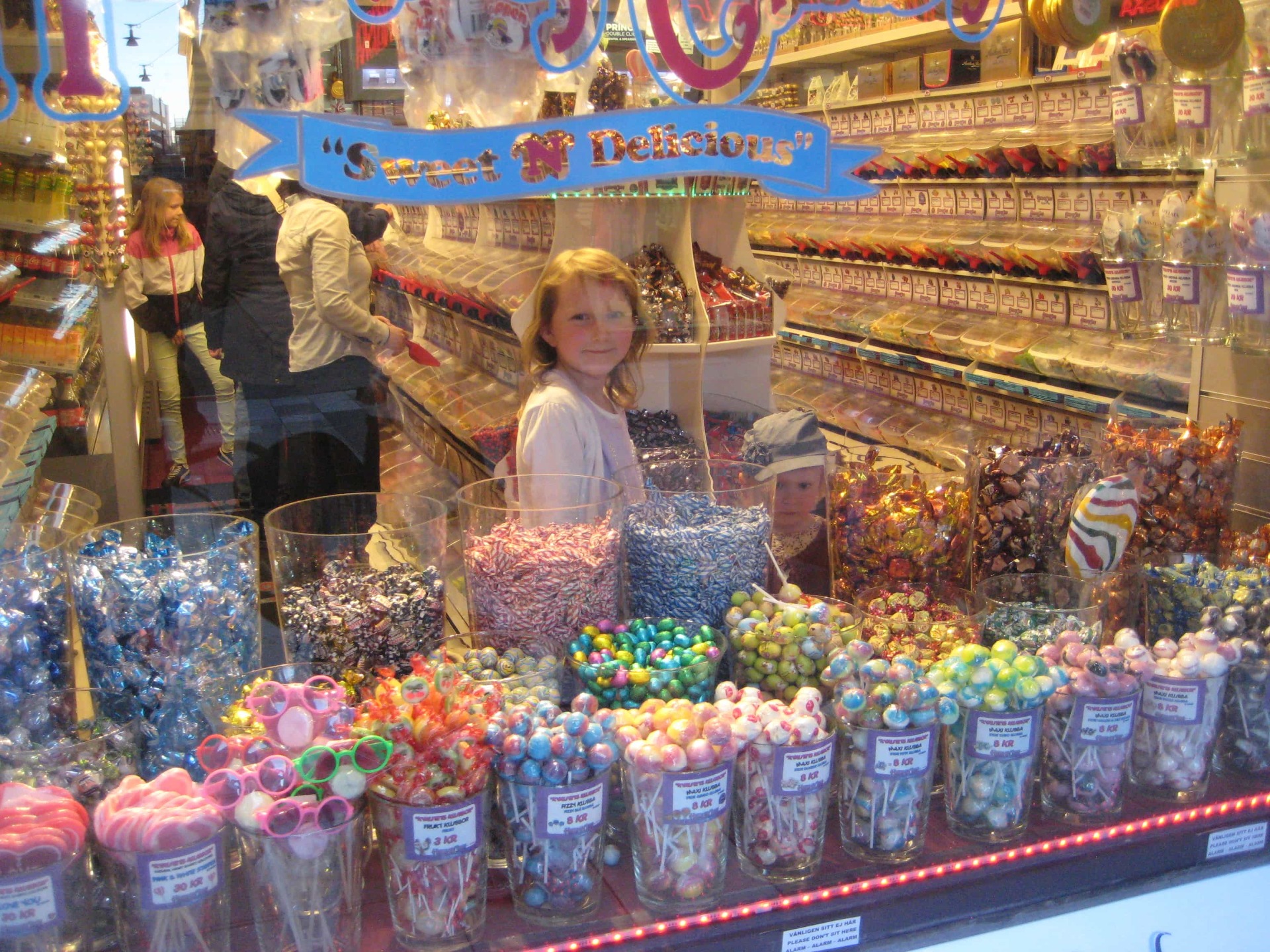 På kvällen var vi på en super bra restaurang som låg mitt i stan. det tyckte ni var mysigt och efteråt hittade vi en stor, stor godisaffär.